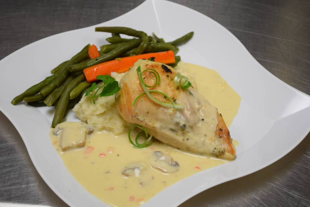 Pan seared stuffed chicken breast with creamy spinach and feta cheese and fresh herbs with a light creamy sauce