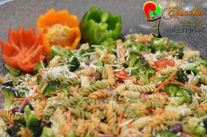 Tri Color rotini pasta marinated with Italian dressing and herbs, fresh vegetables and grated parmesan cheese